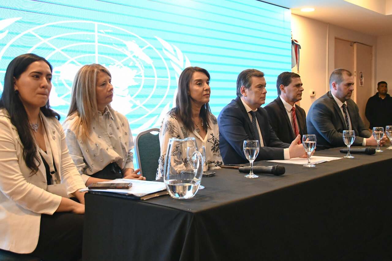 El gobernador estuvo acompañado por las ministras de Educación, Ciencia y Tecnología, Mariela Nassif, y de Justicia y DD.HH, Matilde O’Mill; también el secretario de Ciencia y Tecnología, Adrián Suárez; el director de Gestión Pública, Ricardo Montenegro, y la secretaria general de Coordinación del Encuentro, Sol Basualdo.