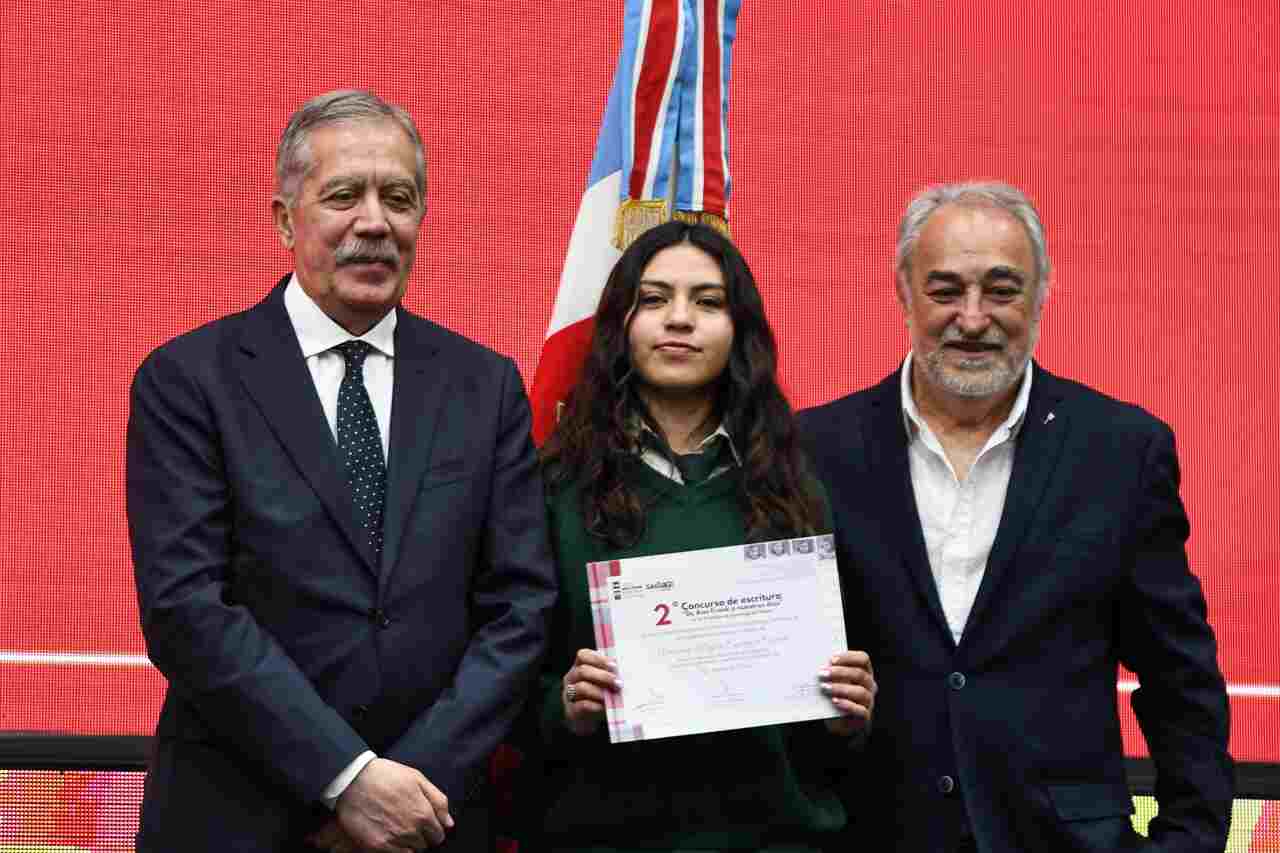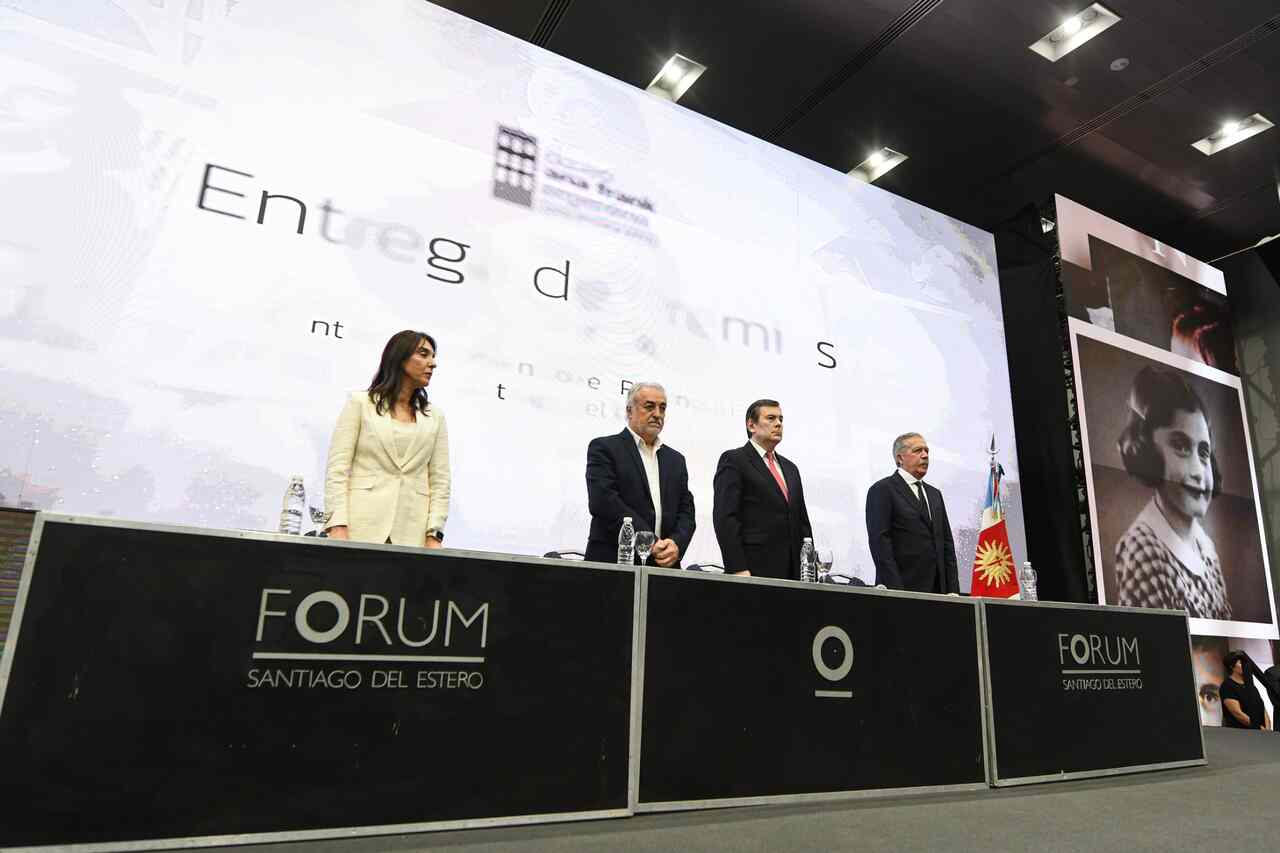 El gobernador Gerardo Zamora, junto con el director del Centro Ana Frank Argentina para América Latina, Héctor Shalom, participó este martes de la ceremonia de entrega de premios del 2° Concurso de Escritura “De Ana Frank a nuestros días”, realizado en el Centro de Convenciones Fórum, acompañados en el panel por el jefe de Gabinete, Elías Suárez, y la ministra de Educación, Mariela Nassif.